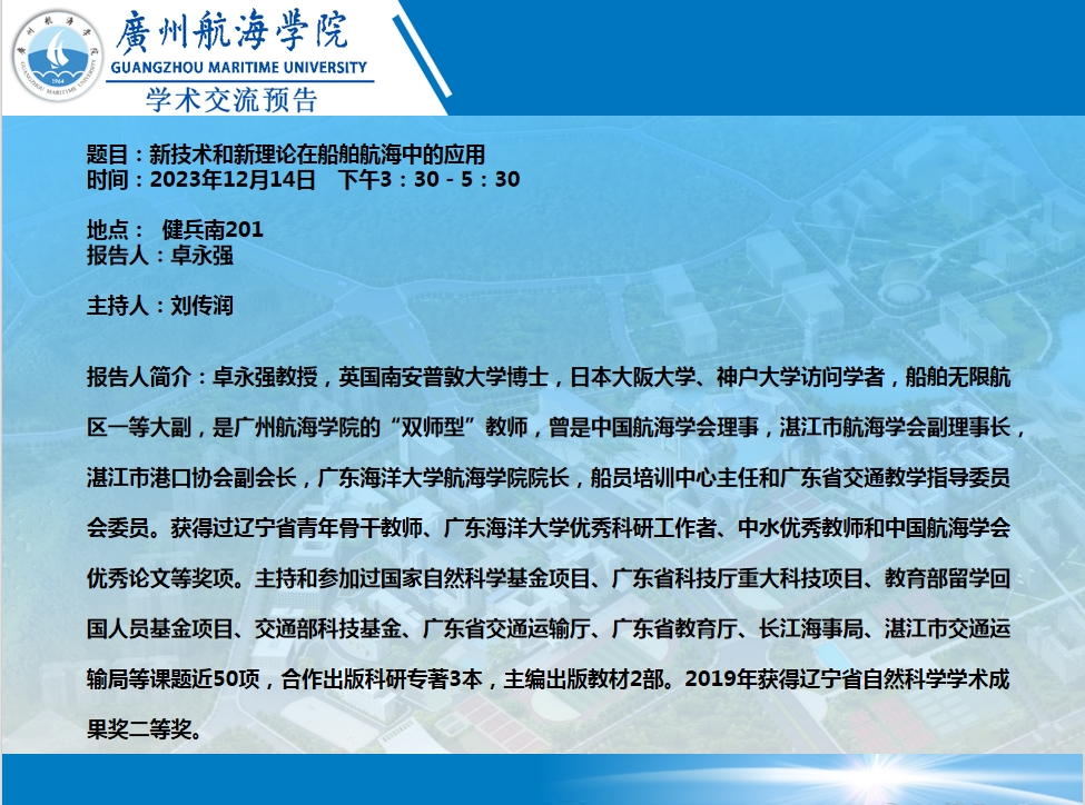 卓永强教授学术讲座预告:新技术和新理论在船舶航海中的应用