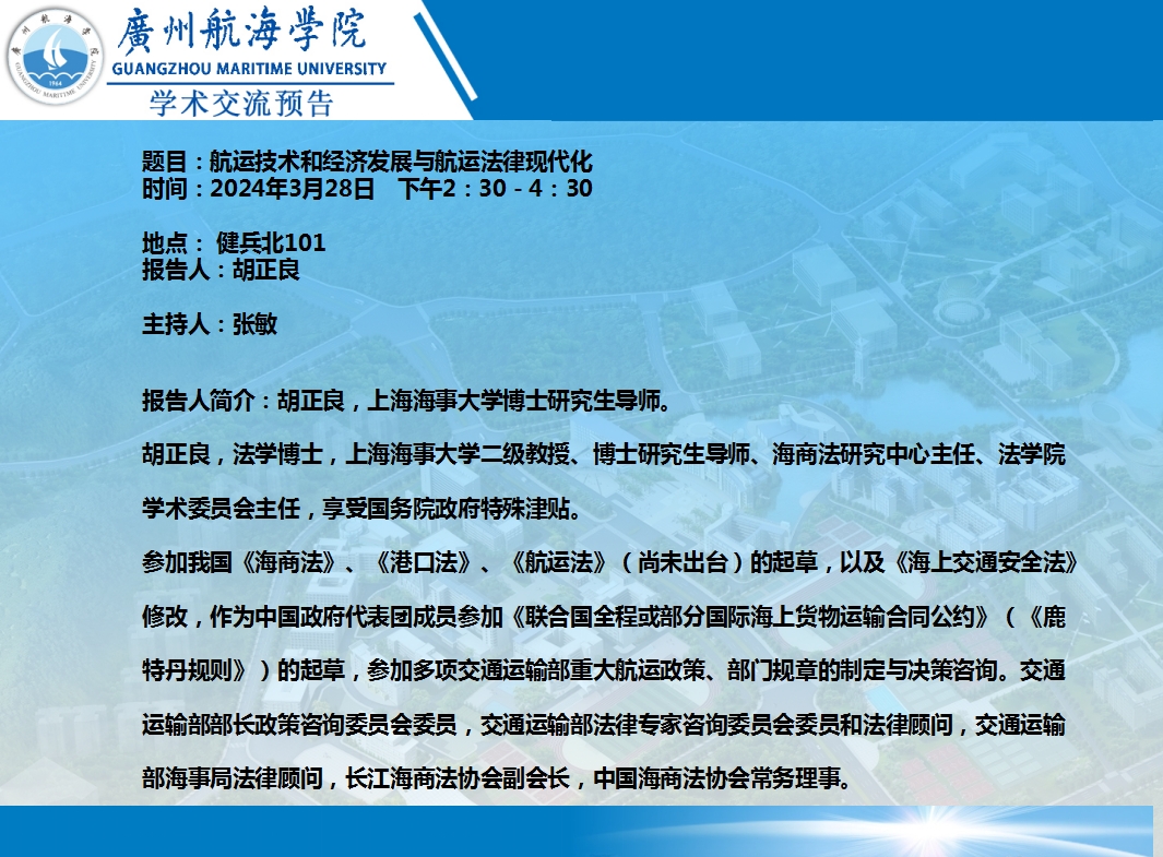 胡正良教授学术讲座预告:航运技术和经济发展与航运法律现代化