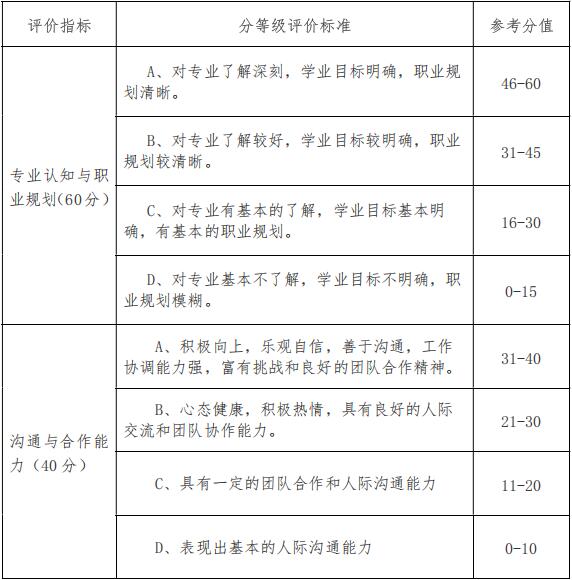 通过资格审核的学生,统一组织面试,主要考查学生的专业认知、职业规划和沟通合作能力。面试的考核标准如下表: