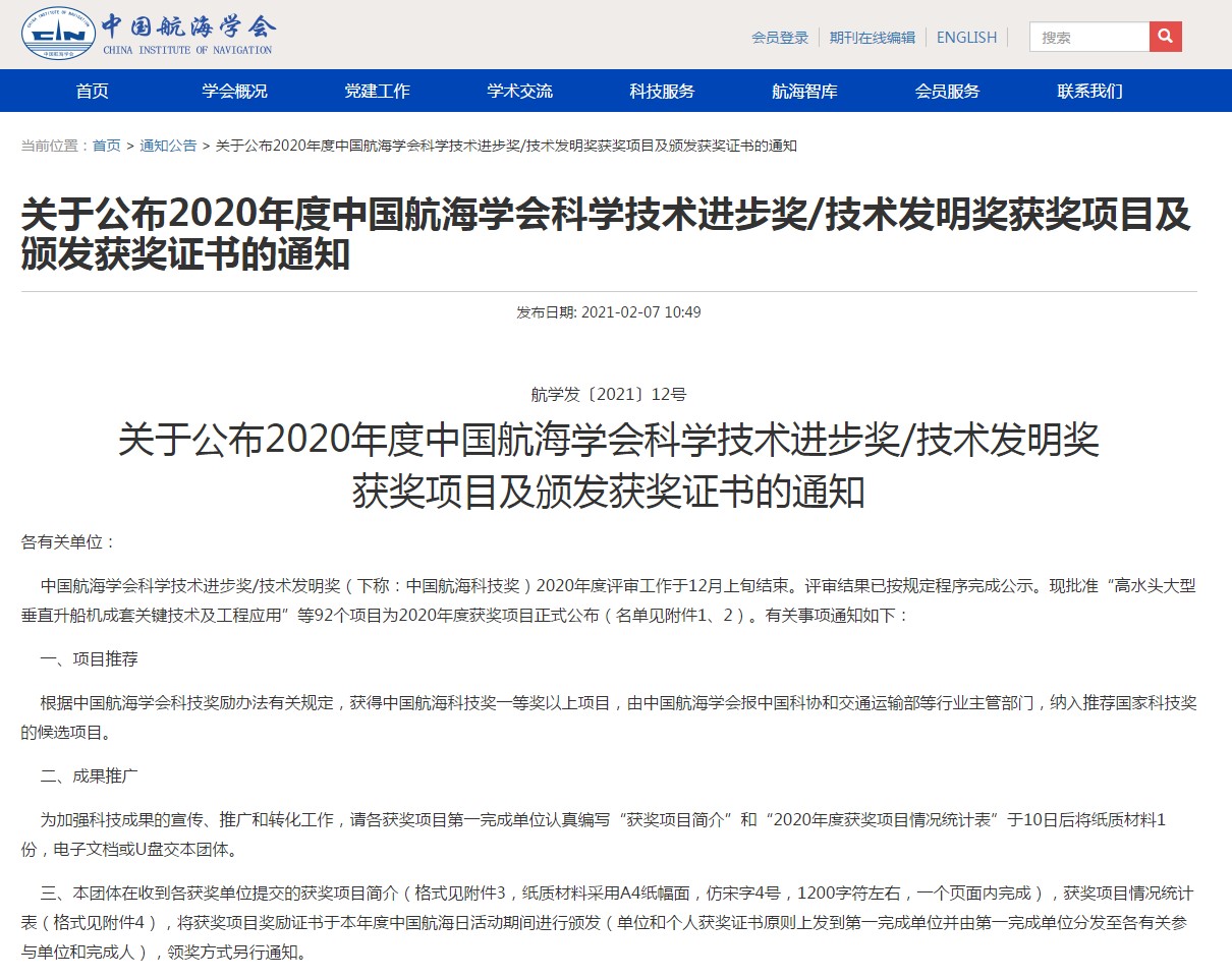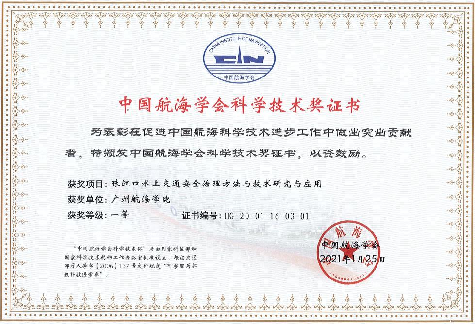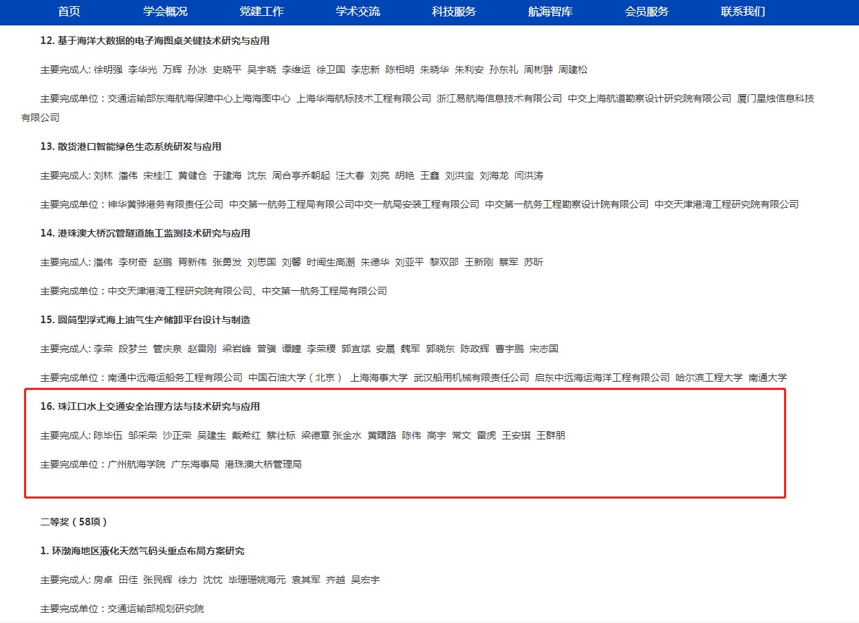 明胜m88官网作为第一申报单位,与广东海事局、港珠澳大桥管理局联合申报的项目《珠江口水上交通安全治理方法与技术研究与应用》荣获“中国航海学会科学技术进步一等奖”。
