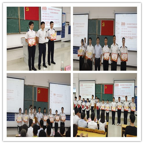 与会来宾及师生一同观看两个大赛的视频回放,展示了海运学子青春心向党的豪情壮志与半军事管理良好的精神风貌。接着,学生党员代表曾晓玲同学对两次比赛开展情况进行总结,重温海运学子用嘹亮歌声赓续红色血脉,传承红色基因。随后,林少栋老师宣读了《关于对“列队上课唱红歌”比赛获奖区队进行表彰的决定》、《关于对“庆祝中国共产党成立100周年大合唱比赛”获奖区队进行表彰的决定》两个文件。李大伟副总经理、马冬青船长、李海兵高级主管等应邀为获奖代表颁发奖金及奖杯。