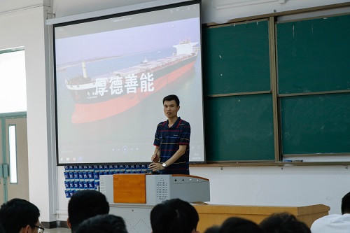 紧接着,李中华经理为同学们播放了广东粤电船舶管理公司的视频,让同学们对广东粤电船舶管理公司有了进一步的了解。李经理表示,航海技术专业的就业方向并非如大家所想的狭窄,只要勤于学习、踏实肯干,就有属于自己在航海领域的一席之地。李经理也对同学寄予希望,在航运事业日益强盛的中国、国际综合影响力日益增强的中国,作为一名船长、一名航海人、一名航海技术的学生,就应该有责任有担当,也应该拥有时代的梦想。