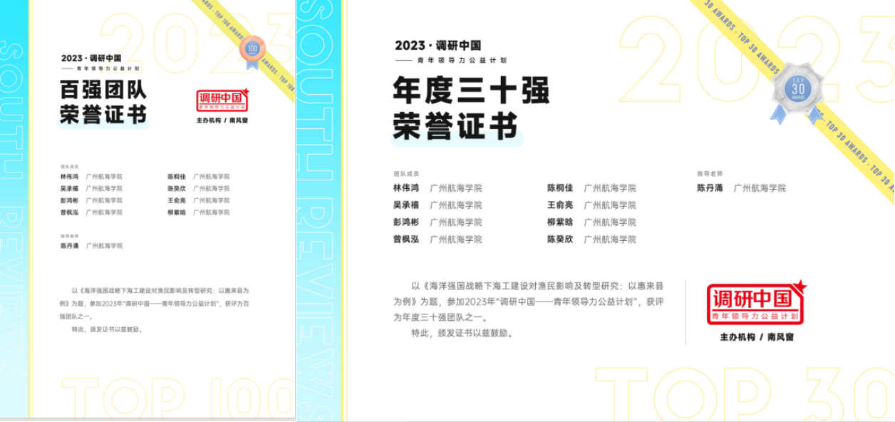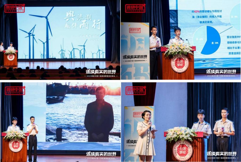 由海运学院学子组成的长风举棹调研团,在陈丹涌副教授的带领下,以作品《海洋强国战略下海工建设对渔民影响及转型研究:以惠来县为例》在年度百强队伍中脱颖而出,入选“2023调研中国年度十强队伍”,成为明胜m88官网首个闯入十强的团队,创造了历史性突破,并在十强路演赛中荣获“三等奖”,同时陈丹涌副教授获得年度“优秀指导老师”称号。