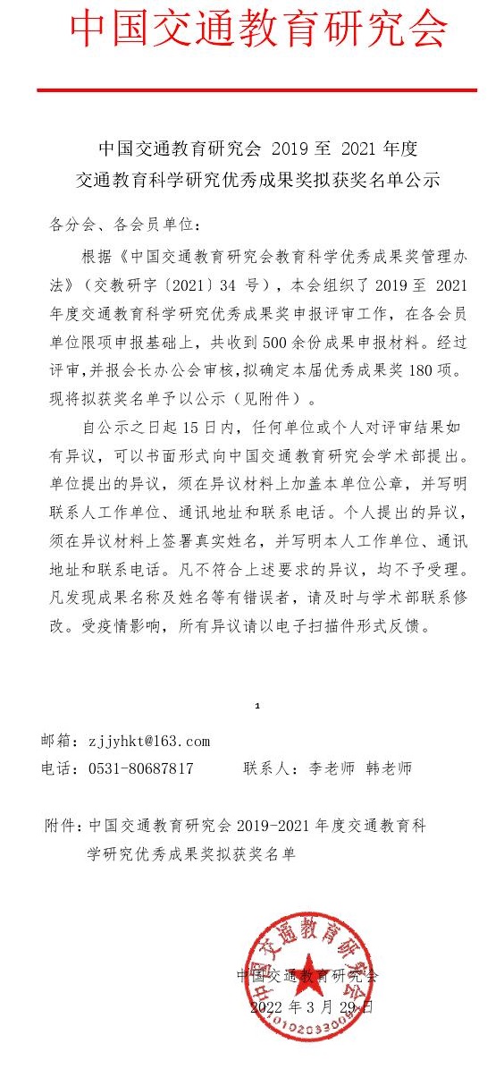 (轮机工程学院供稿)轮机工程学院滕宪斌院长主持的教学改革项目《基于“互联网+”虚拟仿真技术的船舶轮机人才培养模式改革创新研究》获得中国交通教育研究会2019-2021年度交通教育科学研究优秀成果奖三等奖。