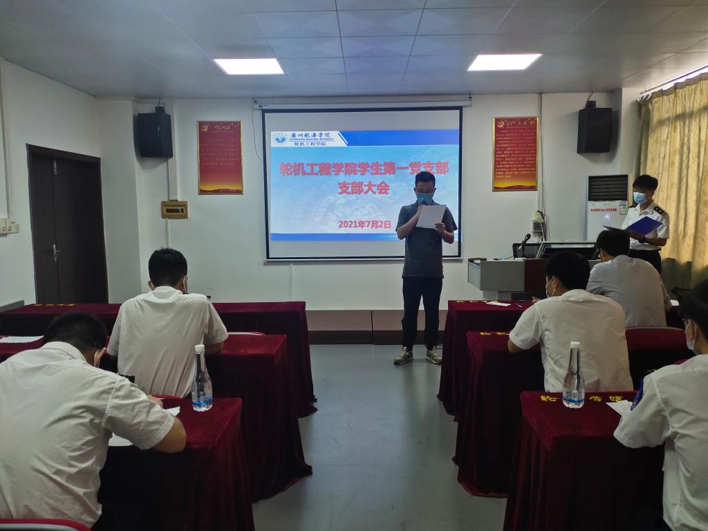 (轮机工程学院 供稿)为庆祝中国共产党成立100周年,深入贯彻落实党史学习教育,规范党员发展流程,经学院党委批准,7月2日下午,学院学生第一党支部在轮机楼511召开大会。学生第一党支部书记郭世俊,中队长杨璟以及学生第一党支部全体党员、预备党员、发展对象参加了会议。