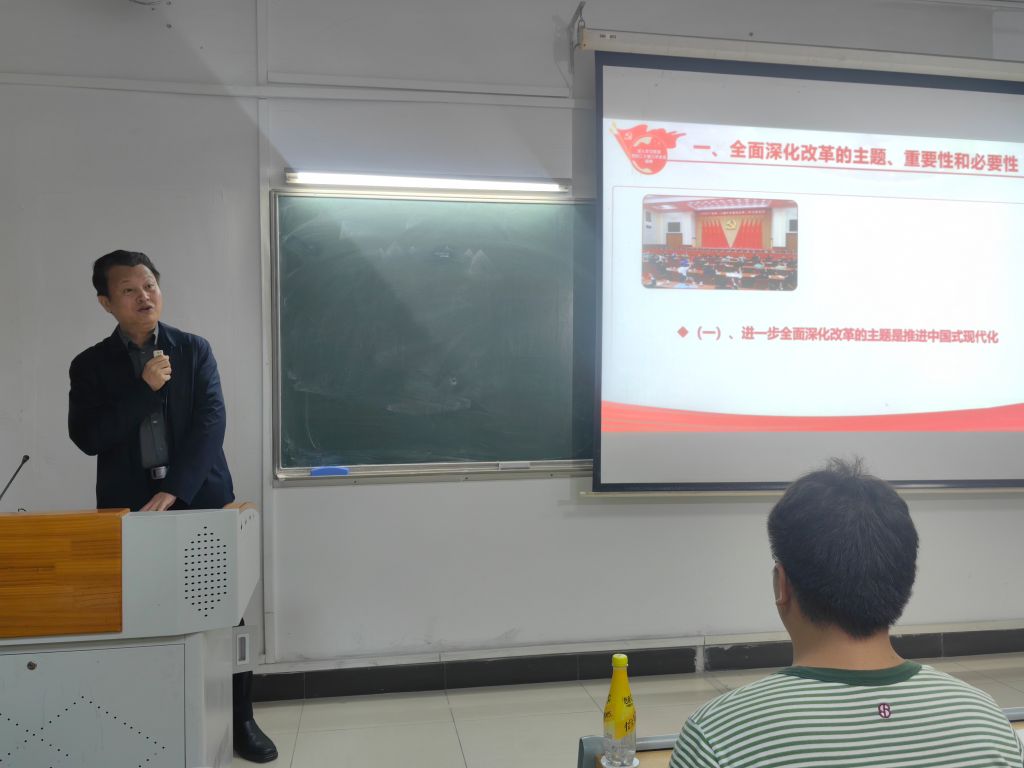 (明胜m88官网 供稿)11月28日晚,为深入学习贯彻党的二十届三中全会精神,加强对党中央关于进一步全面深化改革的战略部署的学习,唐强荣副校长为明胜m88官网轮机245、轮机246全体同学讲授思政课。明胜m88官网党委书记周楠、副院长杨其观、学生工作负责人钟聪仕、中队长赵双双等旁听了此次“思政第一课”。