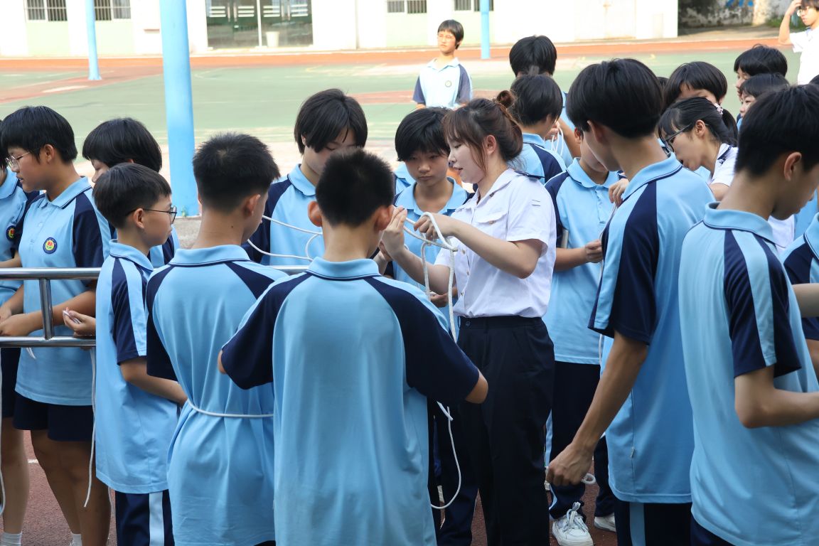 在充满节奏感的绳结表演中,航运学子现场演示了立桶结、瓶口结等10种船舶常用绳结技法,讲解其在航行作业、货物固定中的关键作用。中学生踊跃参与互动,在师生指导下完成绳结编织。“原以为只是简单打绳结,原来每一种都藏着大学问!”有同学兴奋地说。