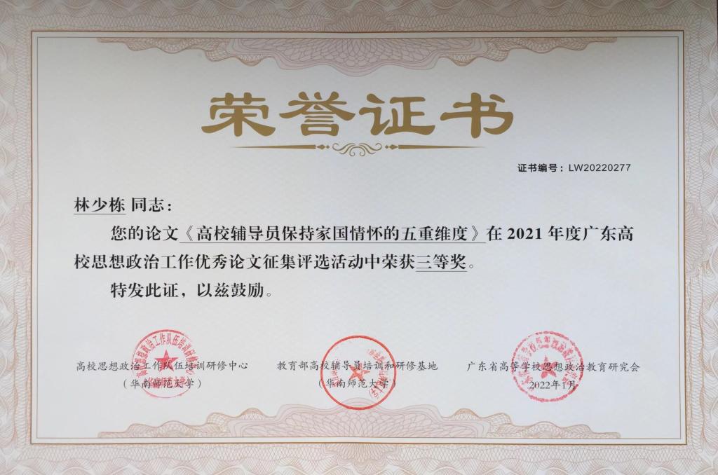 林少栋老师的《高校辅导员保持家国情怀的五重维度》论文在2021年度广东高校思想政治工作优秀论文征集评选活动中荣获三等奖